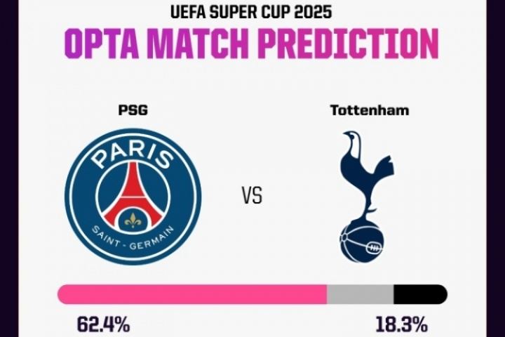 体育资讯08月13日讯 明晨3:00,欧洲超级杯,巴黎圣日耳曼vs热刺。赛前,数据网站opta预测了欧超杯的胜者。