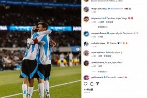 蒂亚戈-阿尔马达在赛后也晒出他和梅西的相拥庆祝照,并艾特了阿根廷国家队官方社媒:“⚽️”